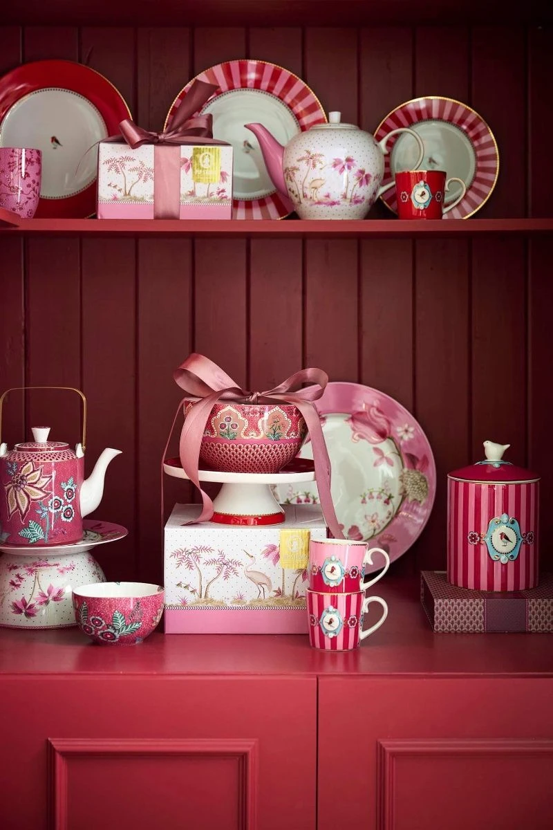 LOVE BIRDS COLLECTION RED-PINK STORAGE JAR MEDALLION STRIPES