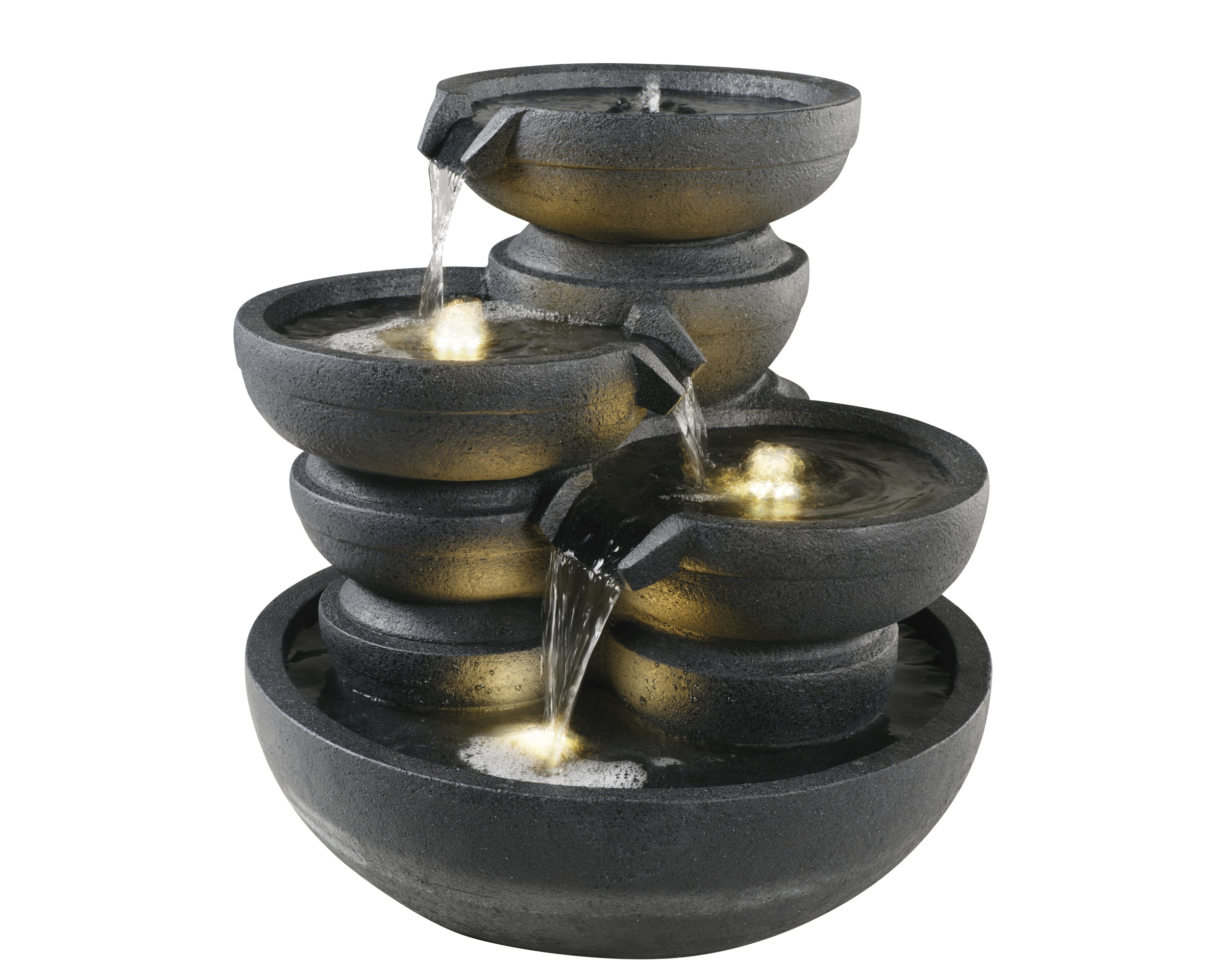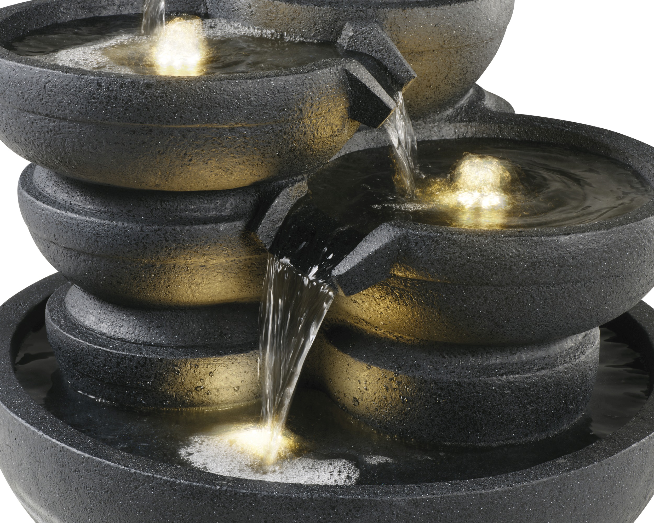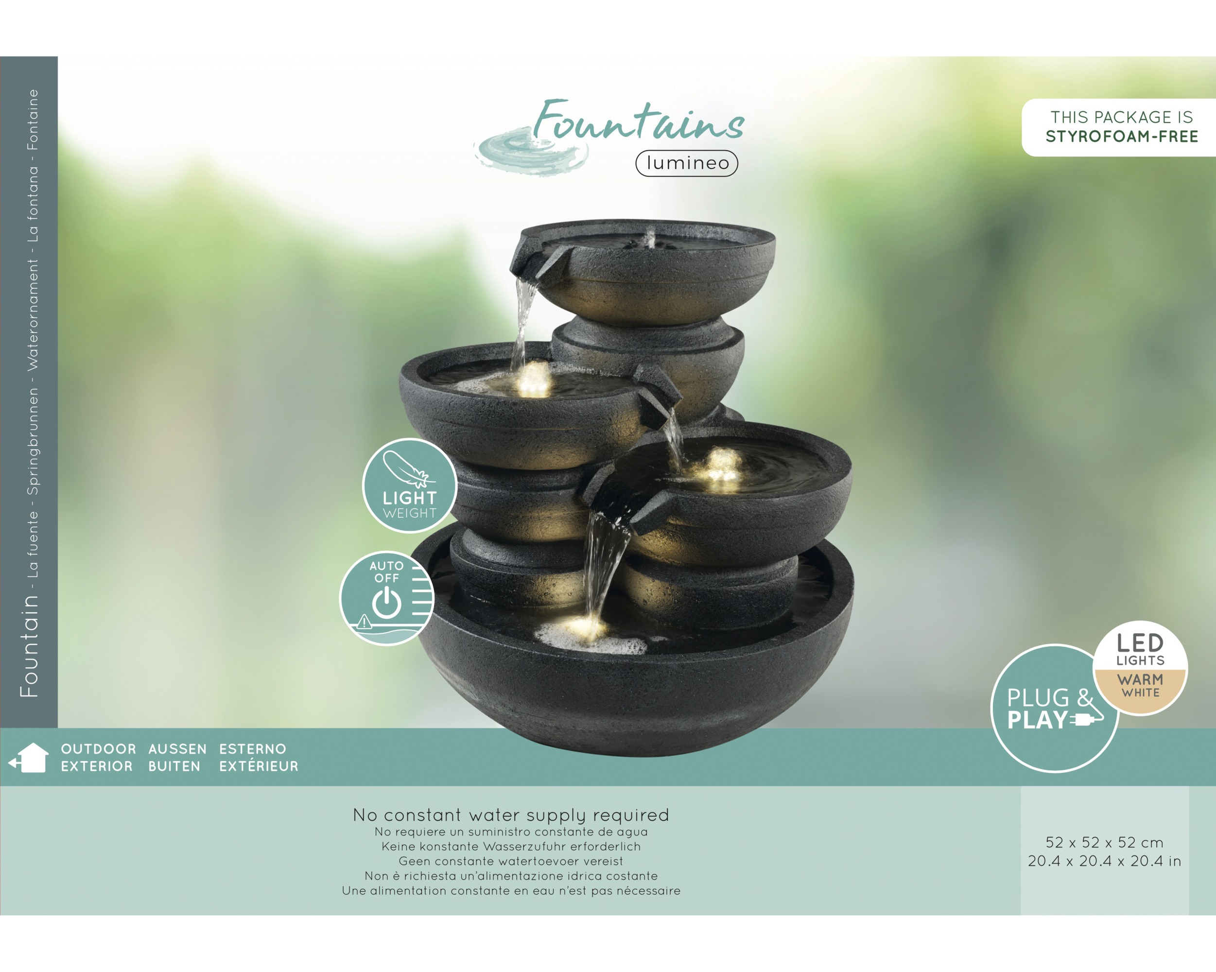 “FOUNTAIN GB BOWL POLYRESIN TRANSFORMER OUTDOOR BLACK 52X52XH52CM WEIGHT 11.5KG LEAD CABLE LENGTH:1000, PRODUCT IP CLASS: IP-67, NUMBER OF BULBS:18 WARM WHITE, PLUG TYPE: GB, QUALITY MARK: CE/UKCA, RUNNING DAYS:5DAYS”