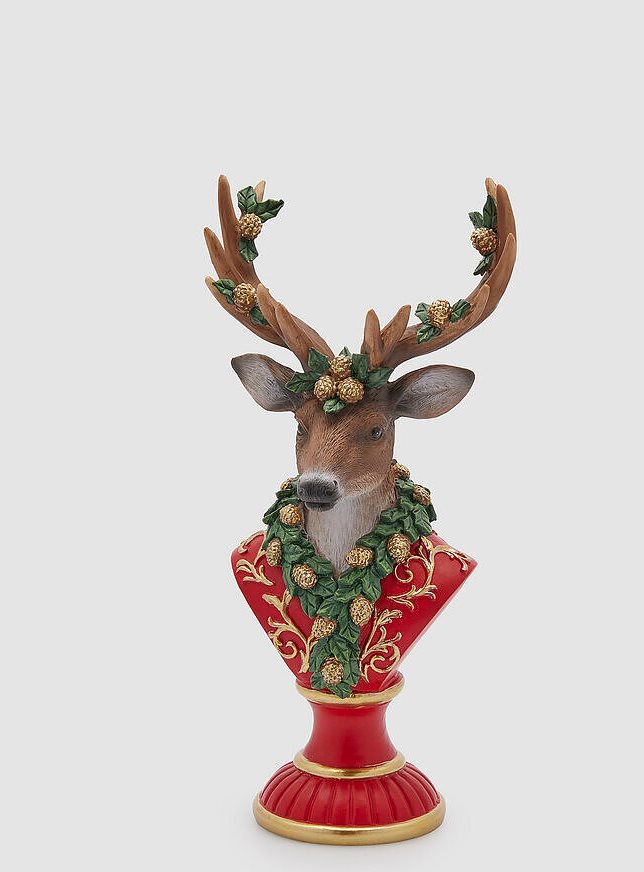 Polyresin small reindeer renna with pine decor red+green 13 x 16 x H.33cm